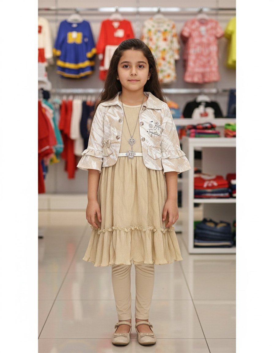 This casual frock with denim jacket and legging set is designed to give a smart and comfortable everyday look. The frock features a soft, flowy silhouette, while the denim jacket adds a stylish layered touch. The matching legging provides a flexible and snug fit for easy movement. Made from breathable, skin-friendly fabric, this outfit is perfect for outings, playtime, and casual occasions with a trendy finish.