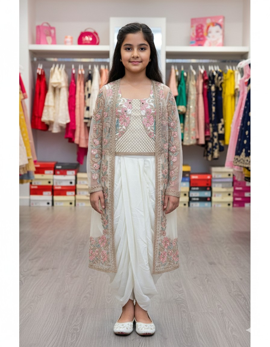 Stylish kids dress paired with a trendy shrug, designed for a modern ethnic look. Made from soft, comfortable fabric for easy wear and movement. Perfect for parties, festivals, family functions, and special occasions, offering a smart layered style with elegance and all-day comfort.
