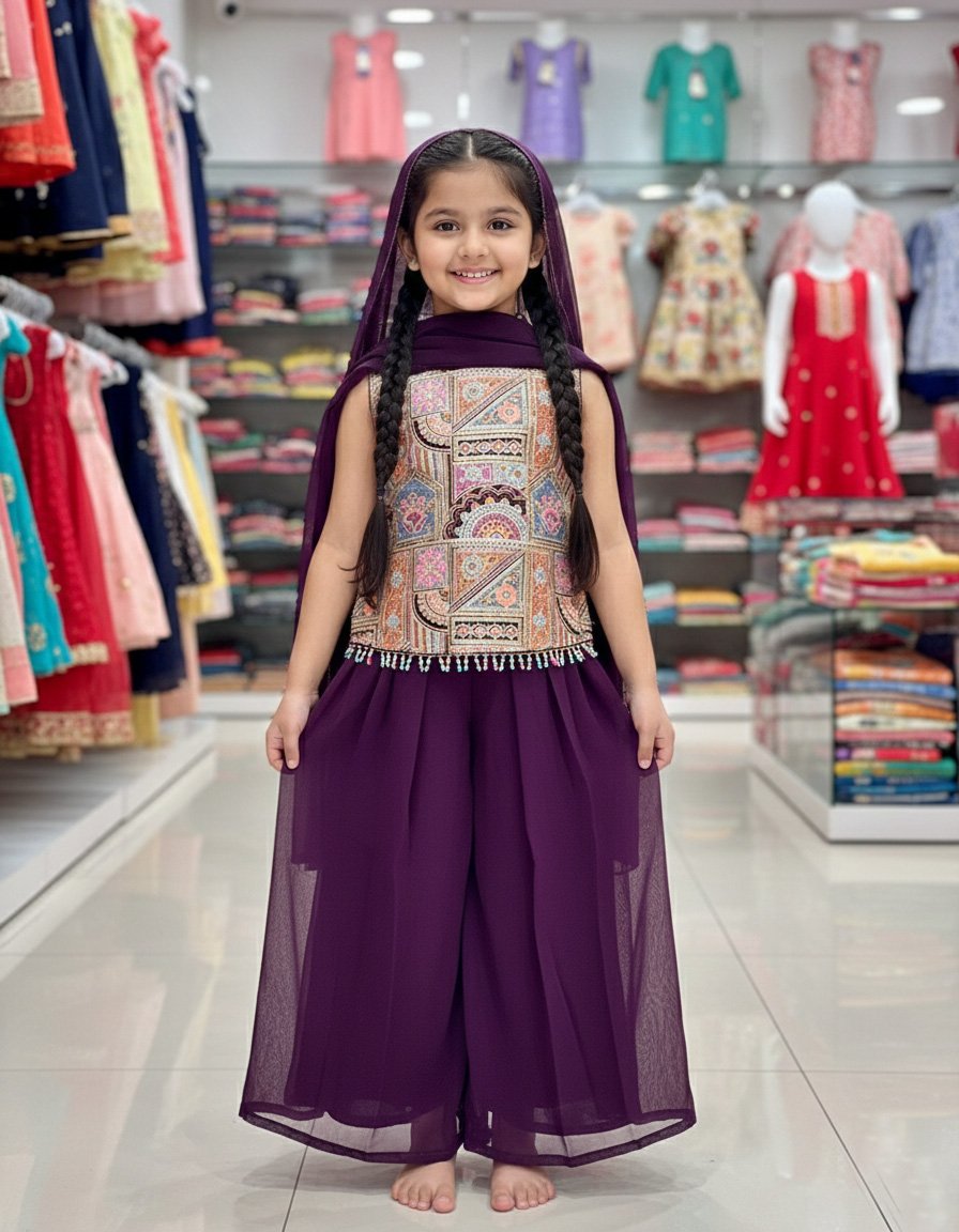 Stylish kids palazzo suit featuring a beautifully designed kurta paired with comfortable palazzo pants and a matching dupatta. Made from soft, breathable fabric for easy movement. Perfect for festivals, parties, weddings, and family functions, offering a graceful ethnic look with all-day comfort.