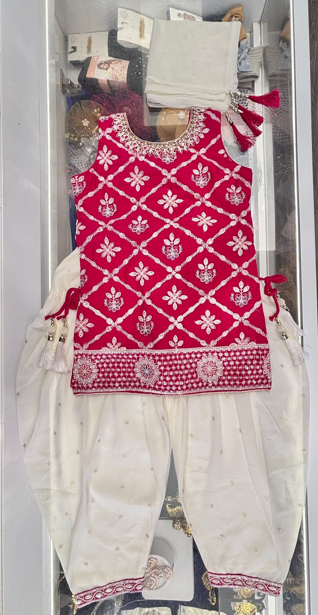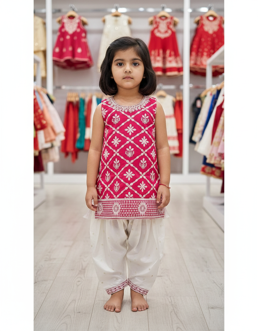 This kids salwar suit for girls up to 12 years is designed for comfort and style. Crafted from breathable, gentle fabric, it includes a well-fitted kurta, easy-to-wear salwar, and matching dupatta. Ideal for festivals, weddings, school functions, and traditional events.