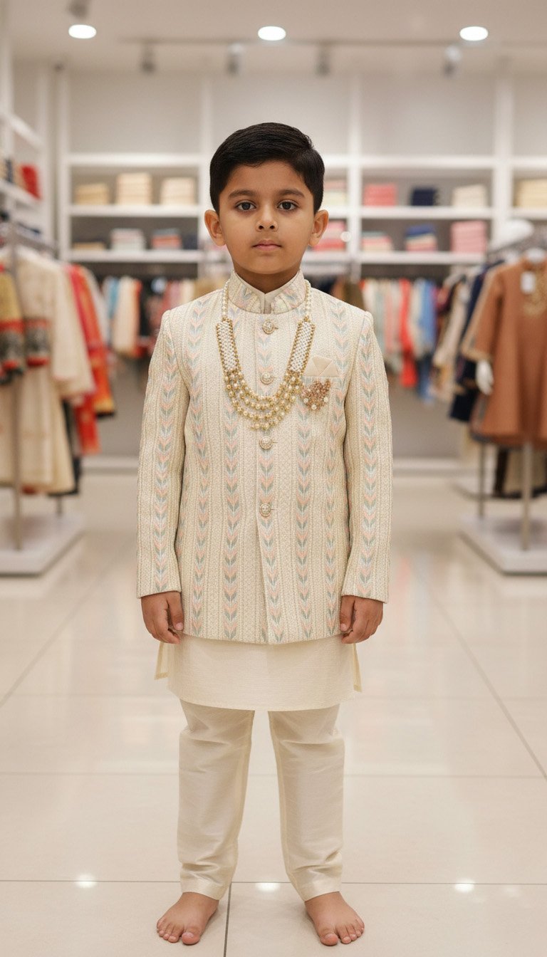 This elegant sherwani set is designed to give a royal and traditional look for special occasions. Crafted from comfortable, skin-friendly fabric, it ensures ease of movement while maintaining a rich appearance. The fine detailing, classic silhouette, and matching bottom add a festive charm. Perfect for weddings, festivals, and celebrations, this sherwani set blends traditional style with modern comfort for a graceful ethnic look.